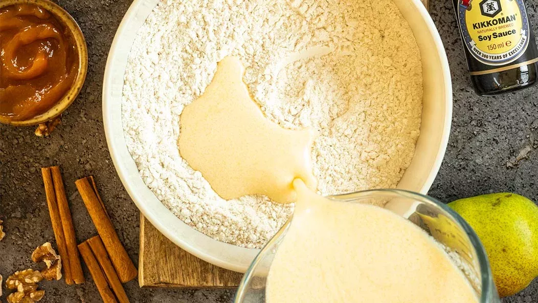 Os bolos clássicos de outono - rolos de canela enriquecidos com nozes estaladiças, peras suculentas e molho de soja com umami. Esta versão saborosa fará as delícias de todos os amantes destes bolos aromáticos.