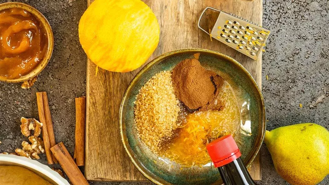 40 g de manteiga – 40 g de açúcar granulado – 1 laranja (para ralar a casca) – 1 colheres de sopa de canela – 1 colheres de sopa Kikkoman Molho de Soja Fermentado Naturalmente