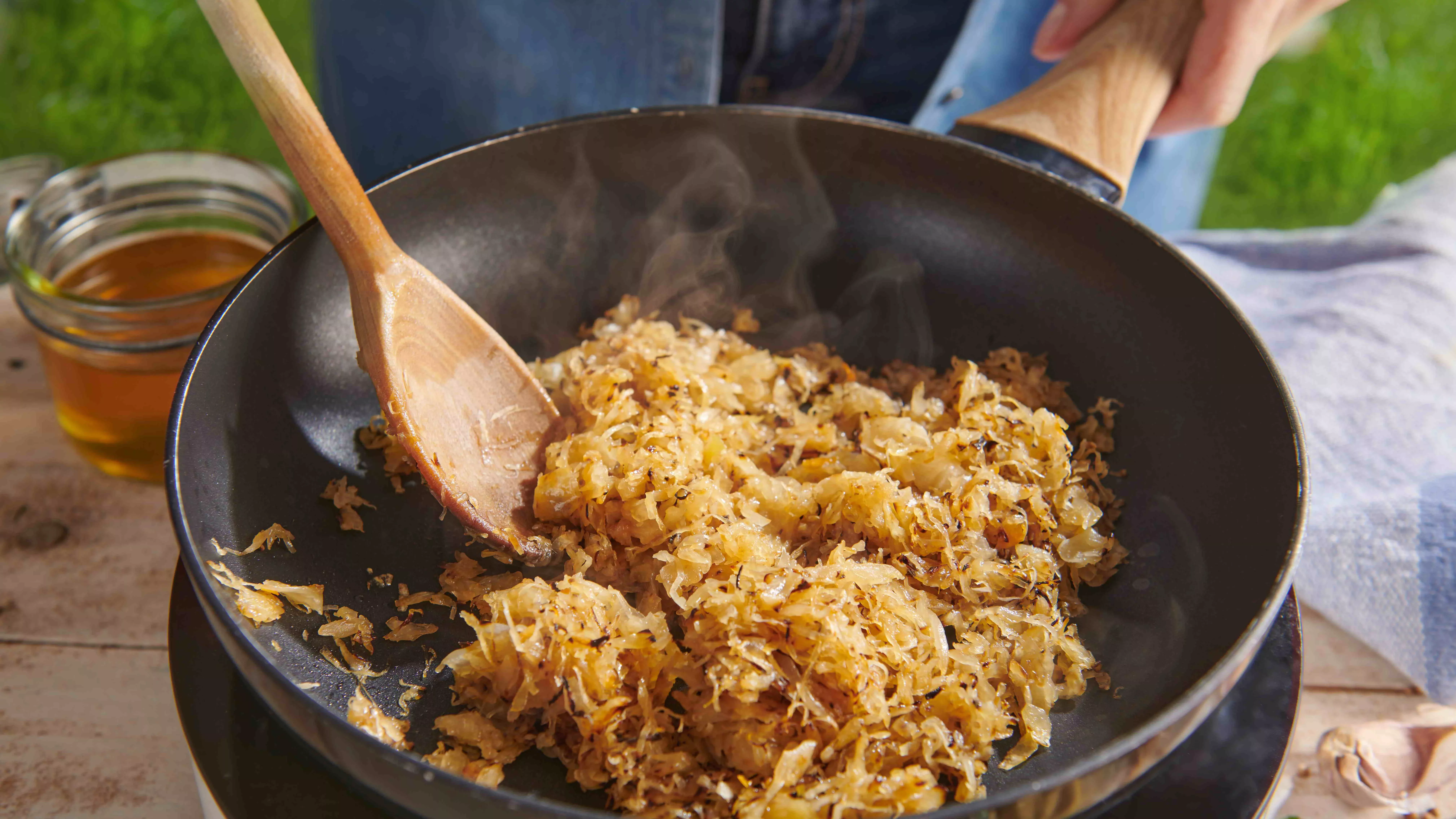 Fritar o chucrute com a mostarda e o mel.