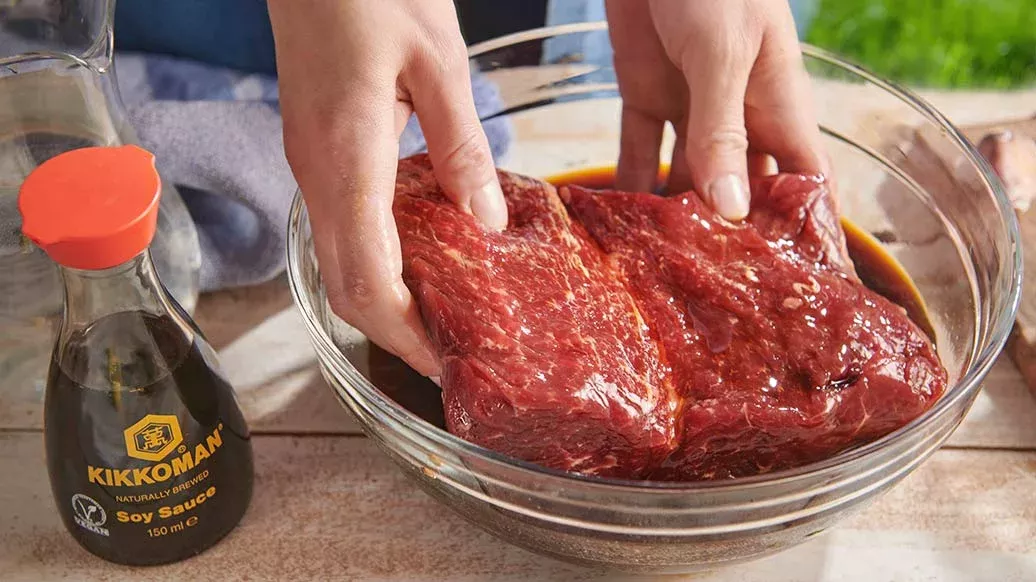 Misture o açúcar mascavado, o molho de soja Kikkoman, o tempero Kikkoman Mirin-Style e a água. Coloque a carne na marinada e leve ao frigorífico durante 1 a 2 dias