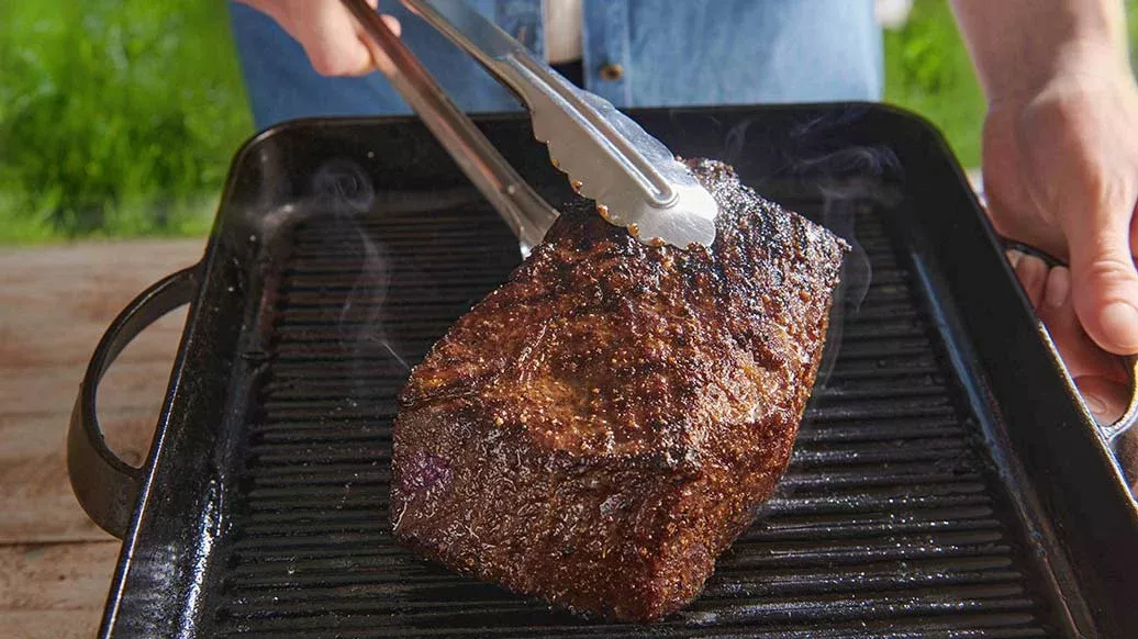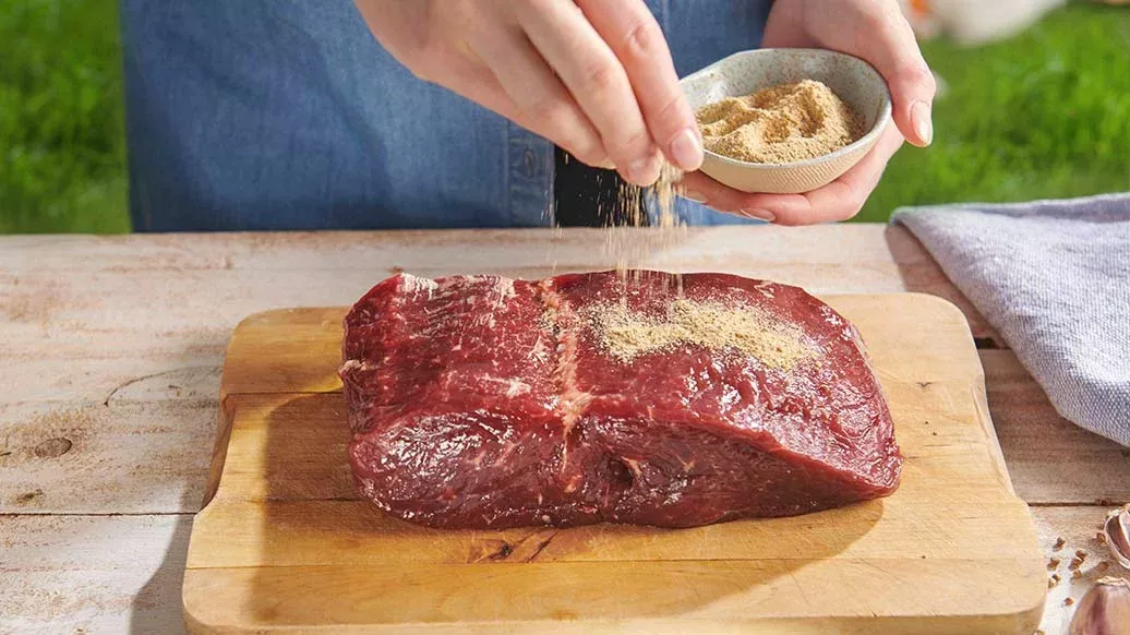 Coloque a carne no grelhador e deixe-a cozinhar durante 30 a 40 minutos, virando-a de vez em quando, dependendo do ponto desejado. Deixe a carne repousar durante 10 minutos ou mais após a confeção e, em seguida, corte-a em fatias finas.