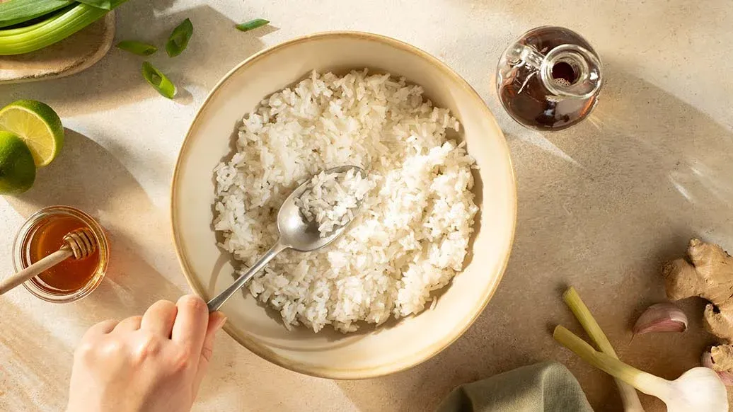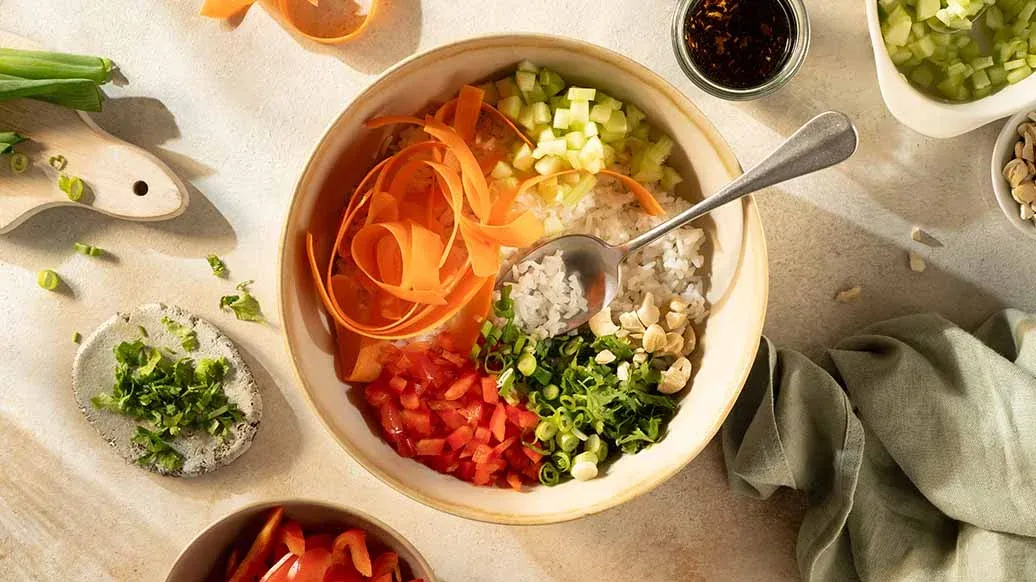 Uma salada refrescante de arroz frio, legumes estaladiços e um molho de soja doce inspirada nos sabores asiáticos - ideal para jantares ligeiros ou churrascos de verão.