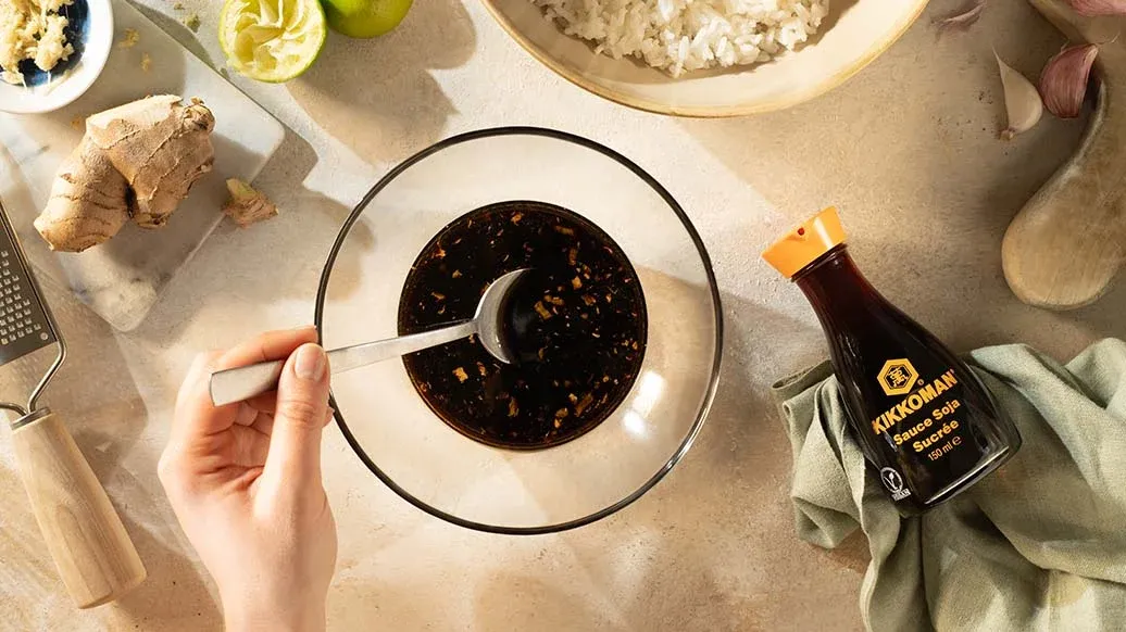 3 colheres de sopa Kikkoman Molho para arroz - doce – 2 colheres de sopa Kikkoman Óleo de Sésamo Tostado – 1 colheres de sopa de vinagre de arroz – 1 colheres de chá de gengibre ralado – 1 dente de alho pequeno, esmagado ou bem picado – 1 colheres de sopa de mel ou xarope de ácer – ½ lima (sumo)