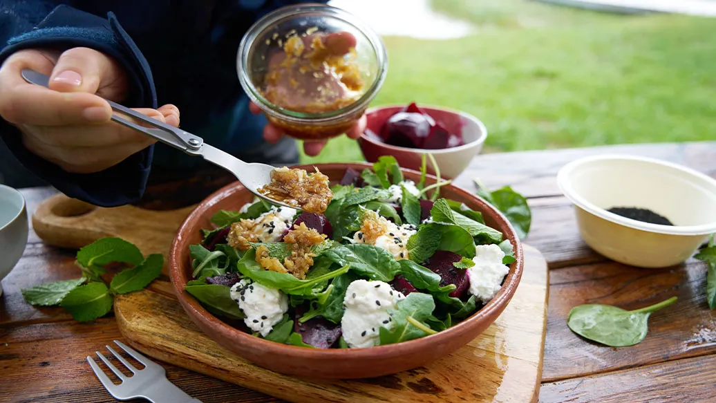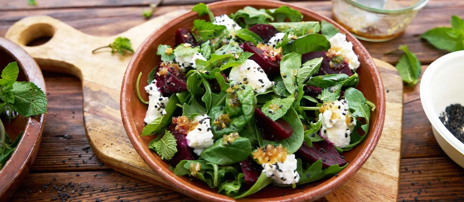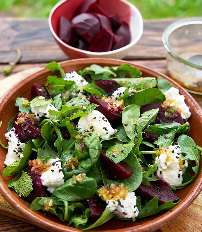 Corte a beterraba assada em fatias e disponha num prato. Parta o ricotta em pedaços pequenos e coloque por cima, depois adicione a rúcula e os espinafres. Regue com o molho, decore com as folhas de hortelã e polvilhe com as sementes de sésamo.