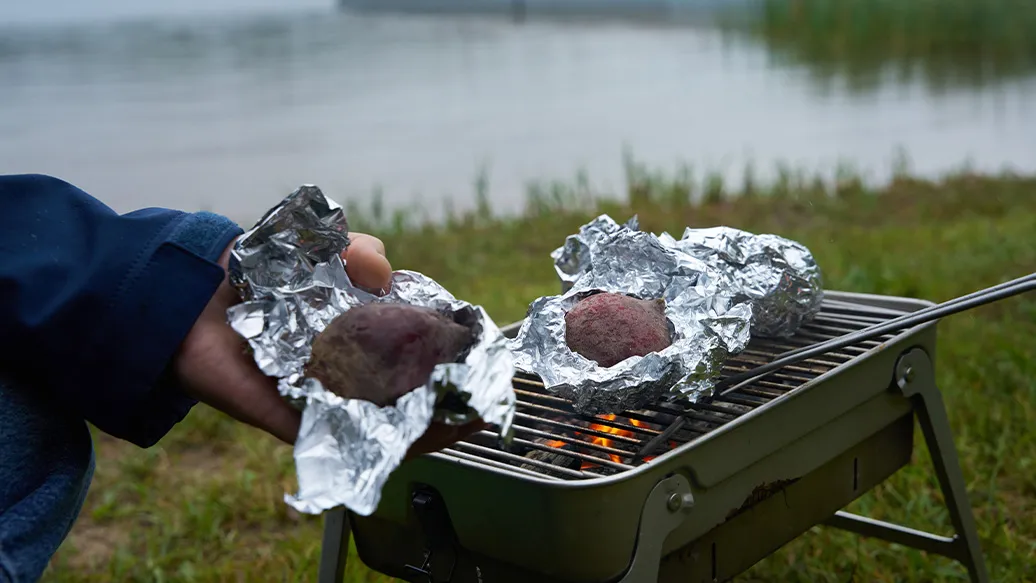 Lave a beterraba, embrulhe em papel alumínio e asse por 45-50 minutos na grelha até ficar macia, ou no forno a 180-200 °C.