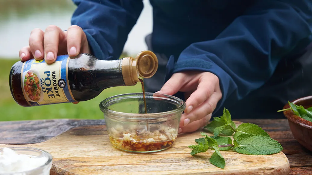 Pique bem o gengibre e o alho e misture com o Molho Kikkoman Poke e o mel para fazer um molho.
