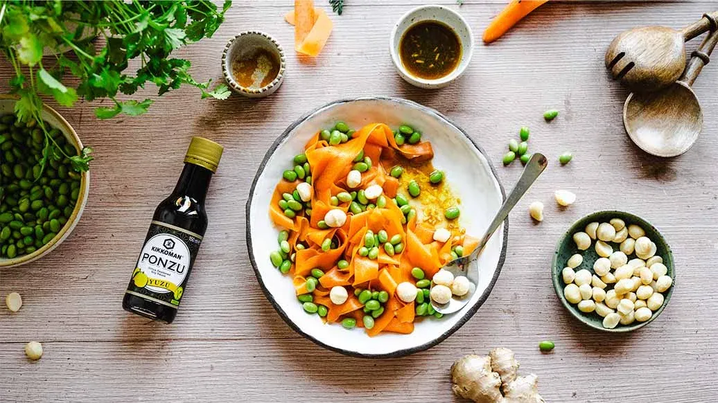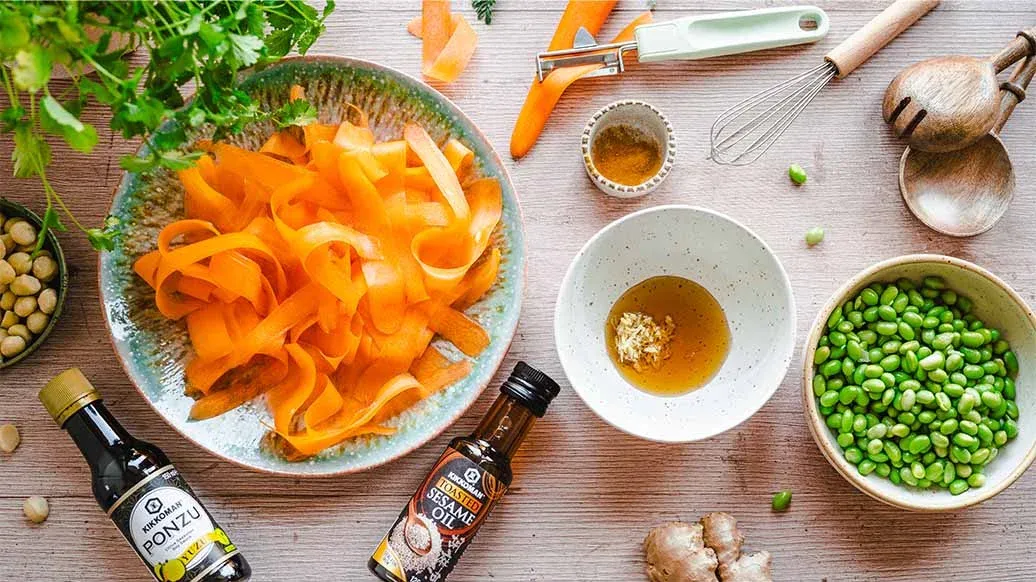 Descasque as cenouras e corte-as em tiras finas. Misture com o Kikkoman Ponzu Yuzu, o Óleo de Sésamo Kikkoman, a curcuma e o gengibre ralado. Deixe repousar durante 10 minutos.