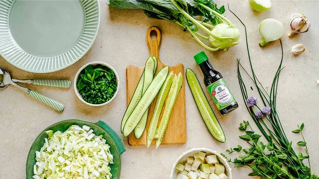 1 couve chinesa – 1 pepino comprido – 1 couve-rábano – 1 punhado de cebolinhas – 1 ramo de hortelã