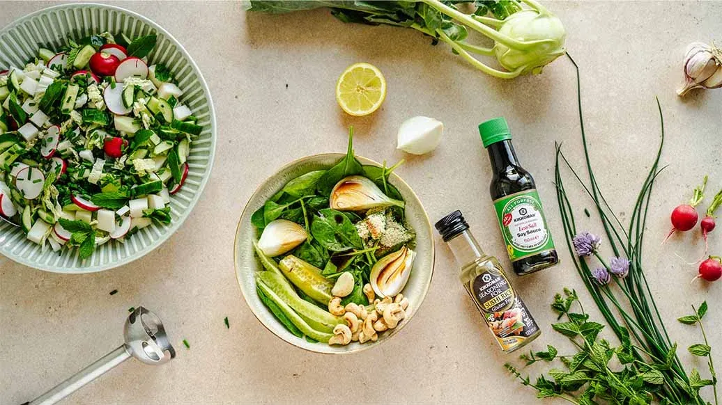 Bata o espinafre, a cebola, o alho e as sementes de pepino reservadas até obter um molho homogéneo com o azeite, o Molho de Soja Kikkoman com Menos Sal, o Tempero para Arroz de Sushi Kikkoman, o sumo de limão, a levedura nutricional e os cajus. Deite o molho sobre os legumes e misture bem.
