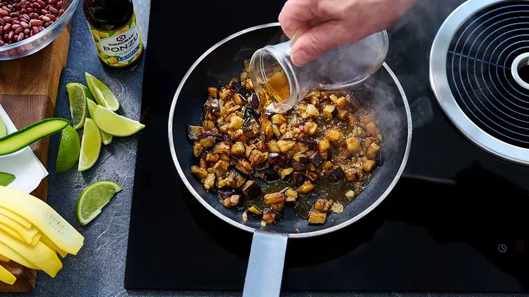 Corte a beringela e a chalota em cubos pequenos e pique o alho. Aqueça 1 colher de sopa de azeite e frite a beringela, a chalota e o alho até ficarem dourados. Deglaceie com o vinagre e o Kikkoman Ponzu Limão. Junte o óleo de linhaça e tempere com a pimenta.