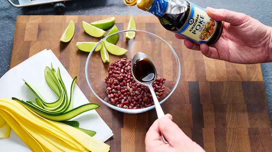 Corte a curgete longitudinalmente em fatias ou tiras. Marine o feijão azuki no molho Kikkoman Poke. Corte a lima em oito partes.