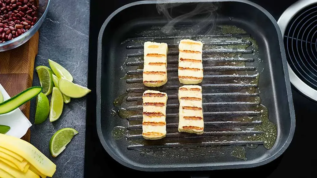 Ideal para o almoço, um lanche saudável no escritório ou uma festa no jardim, esta salada de curgete, feijão azuki e halloumi é acompanhada por um vinagrete quente de beringela feito com Kikkoman Ponzu Limão — refrescante, saciante e rápida de preparar.