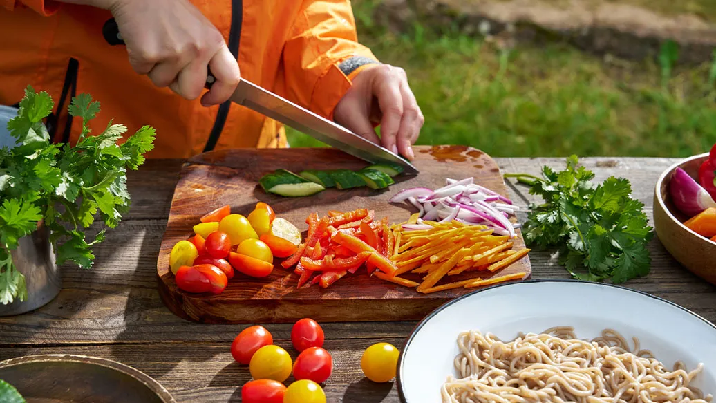 200 g de noodles soba – 80 g de cenoura – 100 g de pepino – 100 g de pimento vermelho – ½ cebola roxa