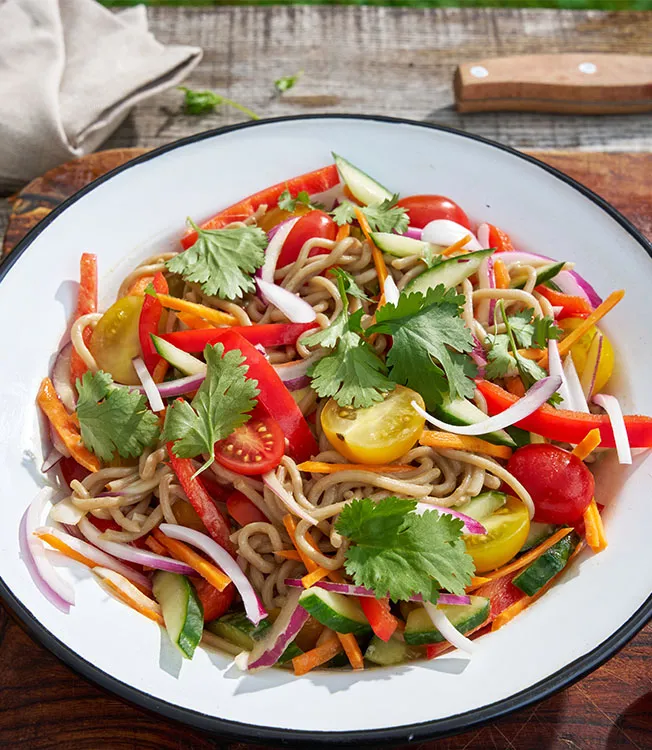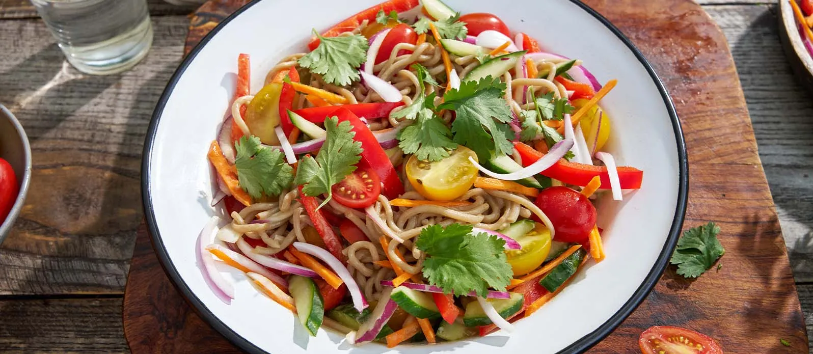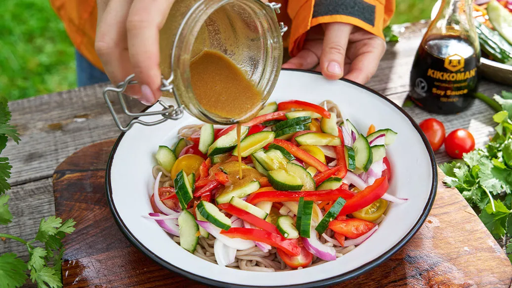 Noodles soba com legumes crocantes e um molho aromático de Molho de Soja Kikkoman e tahini — uma salada leve e refrescante, ideal para o almoço.