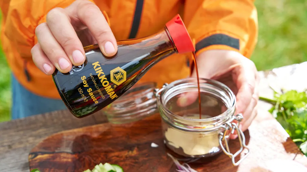 30 ml Kikkoman Molho de Soja Fermentado Naturalmente – 10 ml de vinagre de arroz – 10 ml de xarope de ácer ou mel – 10 g de tahini