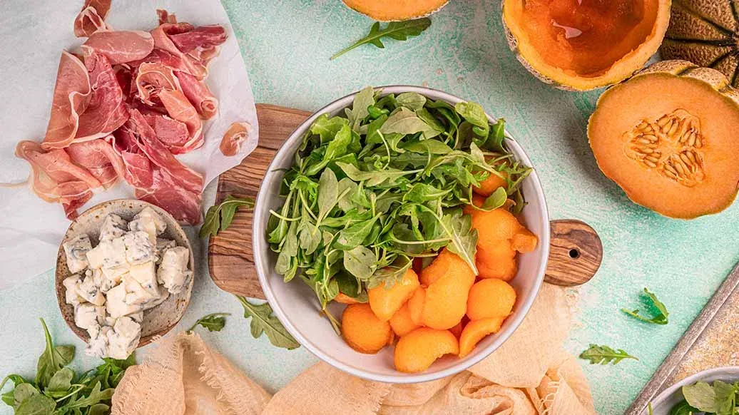 Corte o gorgonzola em pedaços e rasgue o presunto em pedaços menores. Lave e seque a rúcula. Adicione tudo à tigela com o melão e misture delicadamente.
