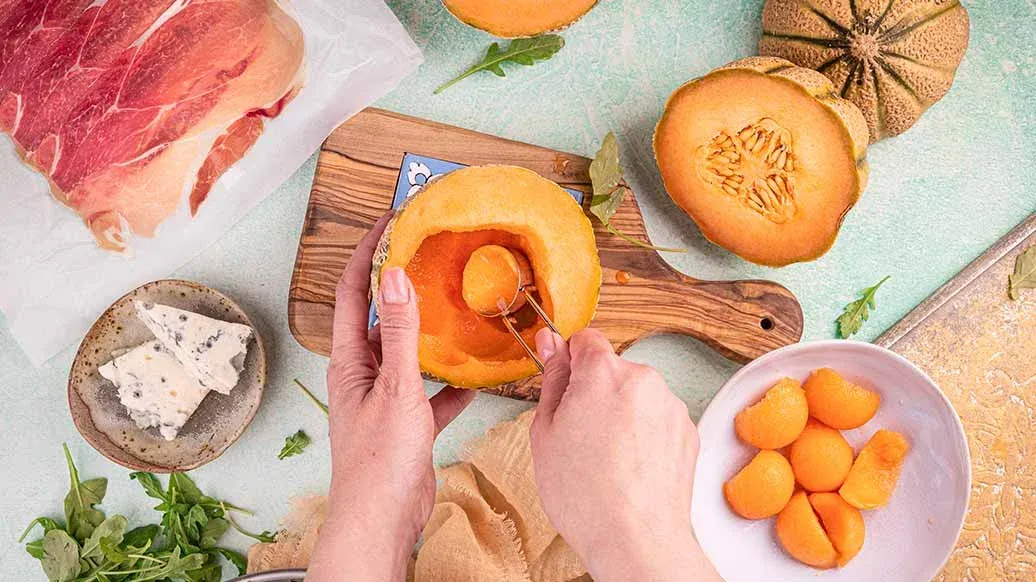 Corte o melão ao meio e retire as sementes. Use uma colher para fazer bolinhas com a polpa ou corte-a em cubos. Transfira o melão para uma tigela.