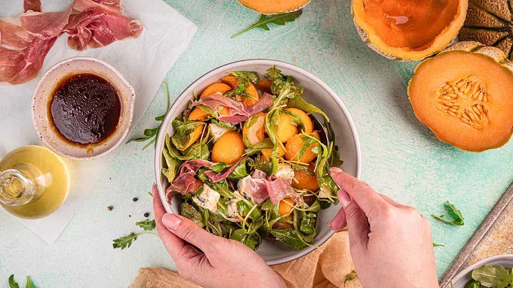 Esta salada de verão combina melão doce com gorgonzola cremoso, presunto forte e rúcula apimentada. Um molho de azeite, mel e Molho de Soja Kikkoman com Menos Sal adiciona profundidade umami. Perfeito para um almoço leve ou um aperitivo elegante.