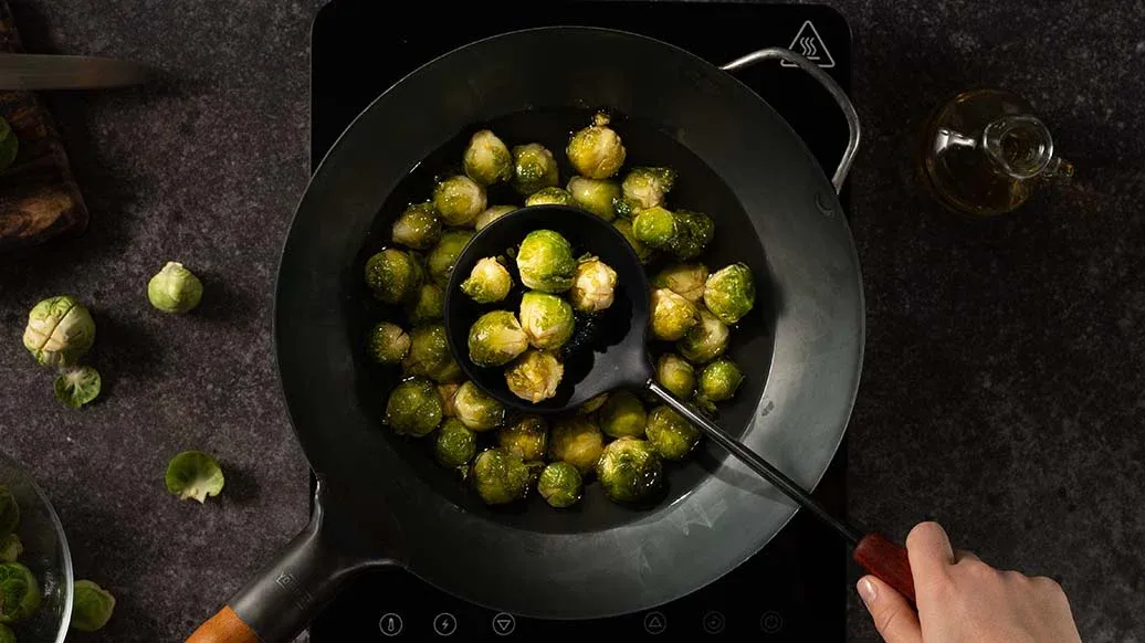 Aqueça o óleo num wok grande. Assim que as folhas de couve-de-bruxelas borbulharem imediatamente ao entrar em contacto com o óleo, este está suficientemente quente (aproximadamente 175 °C). Frite as couves-de-bruxelas em duas porções durante cerca de 4 minutos cada, até ficarem crocantes por fora e macias por dentro. Retire do wok e escorra bem.