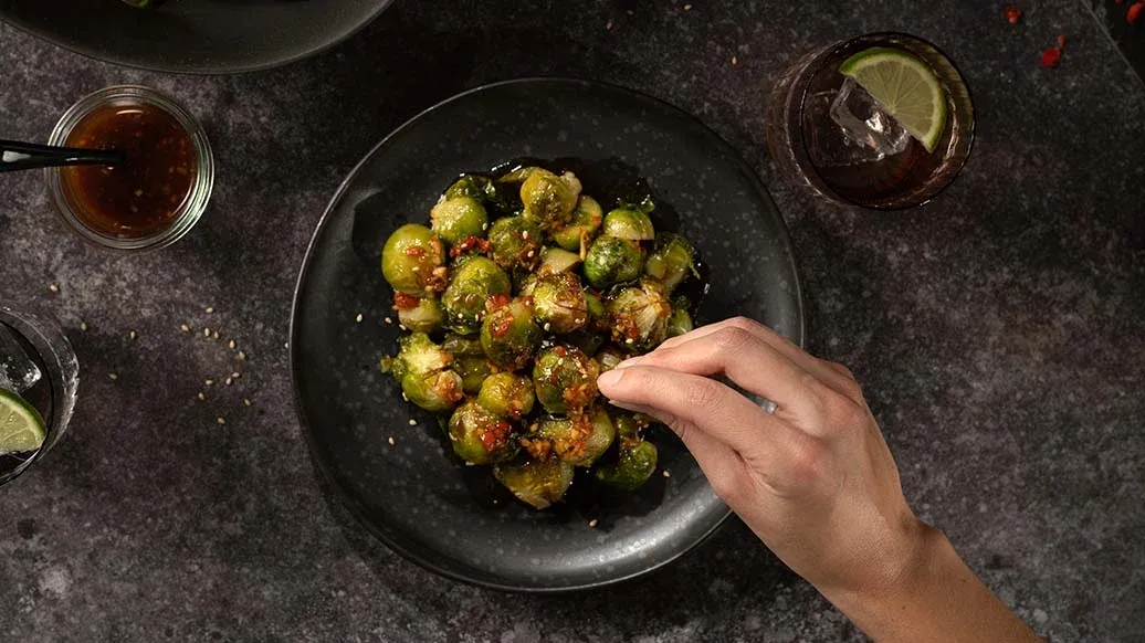 Salanda crocante de couves-de-bruxelas com sementes de sésamo