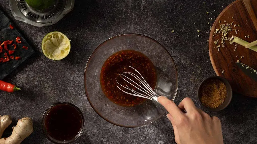 2 limas – 3 colheres de sopa de caldo de legumes – 1 malagueta vermelha picada – 10 g de galanga ou gengibre picado – 1 talo pequeno de erva-príncipe muito bem picado – 1 colheres de sopa de açúcar mascavado (alternativa: açúcar de palma) – 4 colheres de sopa Kikkoman Molho Teriyaki Wok com Alho Assado – 2 colheres de sopa Kikkoman Molho de Soja Fermentado Naturalmente