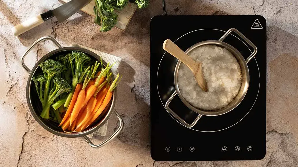 200 g de arroz glutinoso – 400 ml de água – 150 g de brócolos, cortados em floretes e cozidos a vapor ou escaldados – 150 g de cenoura, cortada em palitos, cozida a vapor ou escaldada