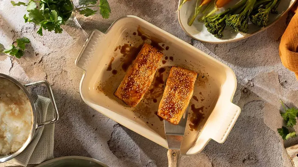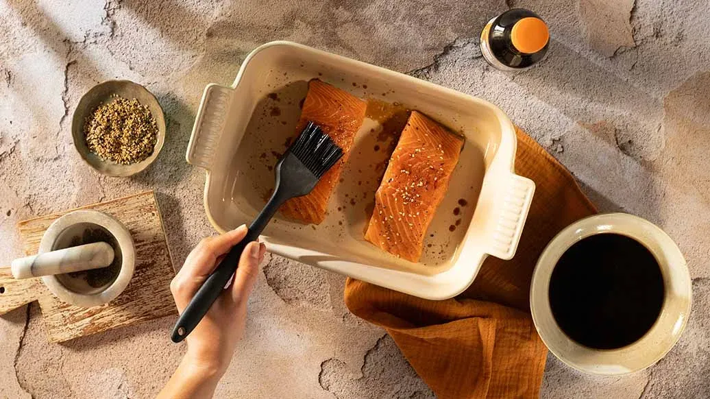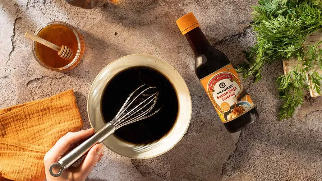 Pré-aqueça o forno a 200°C ( aquecimento superior e inferior). Numa tigela pequena, misture o molho Kikkoman para arroz com o óleo de sésamo Kikkoman e o mel.