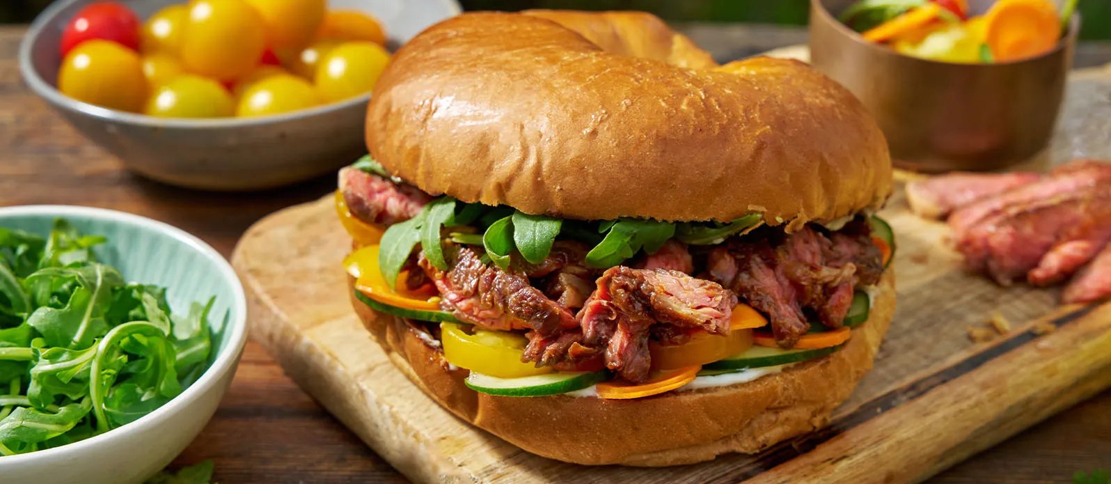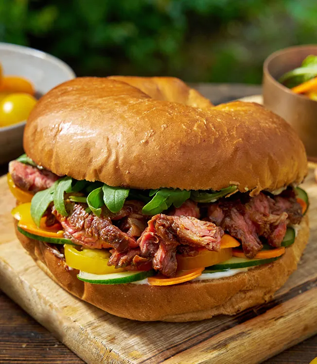 Carne de vaca suculenta marinada em Kikkoman Spicy Chili, servida num pão tipo brioche com pickles crocantes, tomates e rúcula.