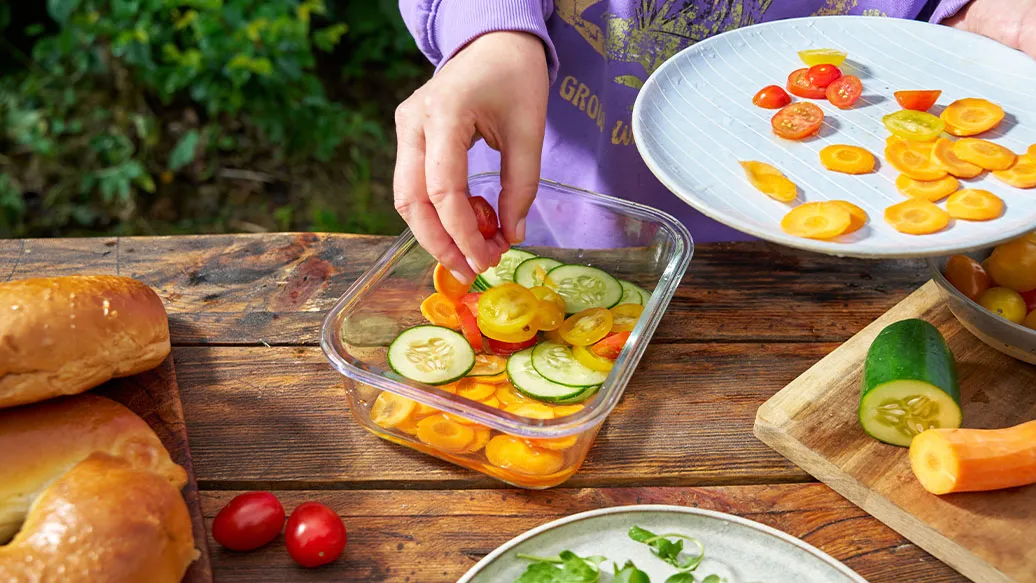 Corte o pepino e a cenoura descascada em palitos finos e corte os tomates cherry. Depois, misture com o vinagre e o mel e deixe marinar durante, pelo menos, 15 minutos.