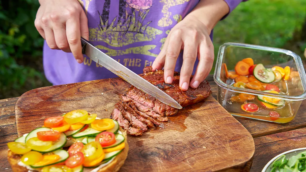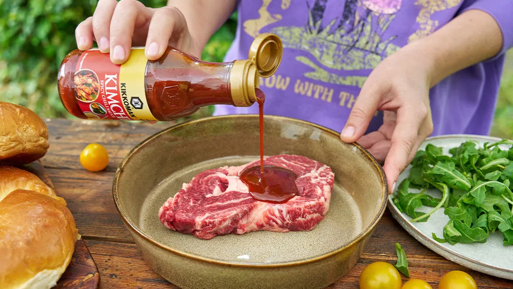 Marine a carne no molho Kikkoman Spicy Chili para Kimchi durante 15 minutos, depois frite ou grelhe 3 a 4 minutos de cada lado. Corte a carne em fatias finas.