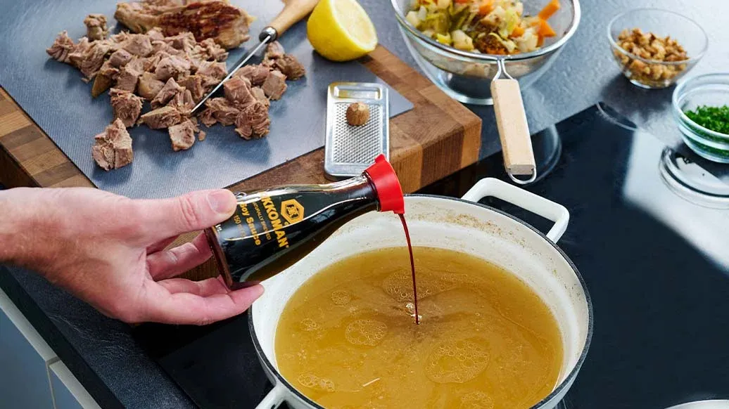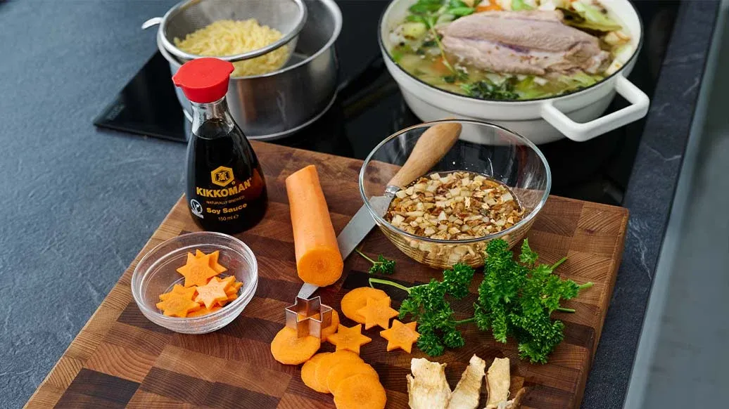 Uma canja de festiva com cenoura, aipo-rábano e alho francês, enriquecida com Molho de Soja Kikkoman e especiarias aromáticas. Servida com massa e cogumelos, esta canja é um prato principal reconfortante para qualquer mesa de inverno.