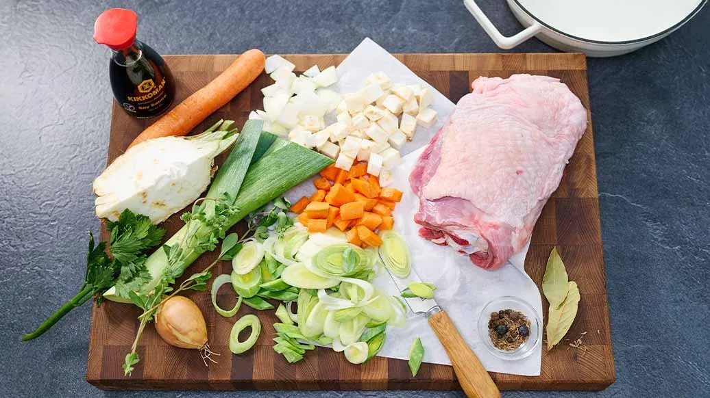 1 cenoura – 1 pedaço de aipo-rábano – 1 cebola pequena – 1 alho francês – 1 perna de peru, com cerca de 1,2 kg – 2 folhas de louro – 2 bagas de zimbro – ¼ de pimenta preta em grão – 4 bagas de pimenta da Jamaica – ¼ colheres de chá de sementes de cominhos – 4 ramos de manjerona – 3 colheres de sopa Kikkoman Molho de Soja Fermentado Naturalmente