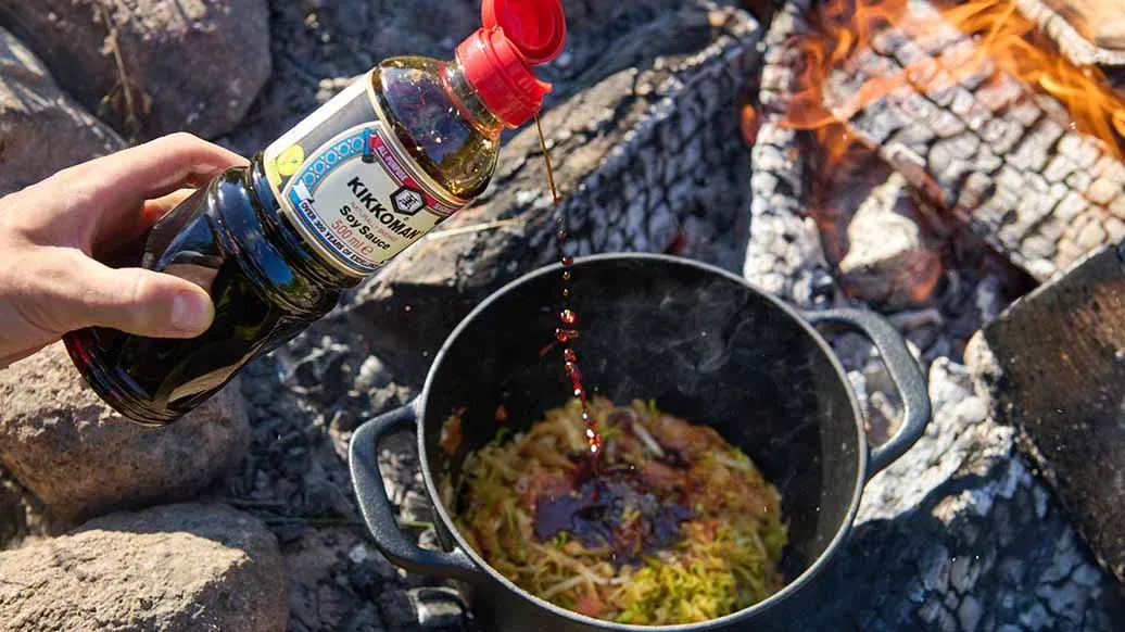 200 g de couve, ralada – 70 g de kimchi, picado – 600 ml de caldo de legumes – 2 colheres de sopa de óleo – 2 colheres de sopa Kikkoman Molho de Chili Condimentado Kimchi – 2 colheres de sopa Kikkoman Molho de Soja Fermentado Naturalmente