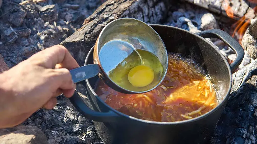 Parta cada ovo para uma chávena pequena ou para um ramequim. Com uma colher, crie um remoinho na sopa a ferver e faça deslizar suavemente os ovos para o centro. Cozinhe durante 3-4 minutos para garantir gemas perfeitamente escorridas. Verta a sopa sobre os noodles de ovos e decore a sopa com o endro fresco picado e as natas azedas.