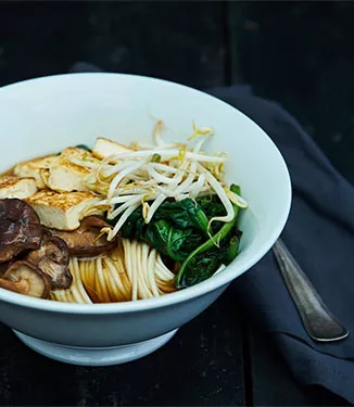Cozer a massa segundo as instruções na embalagem. Lavar bem os rebentos. Dispor a massa, os cogumelos, o tofu, o espinafre e os rebentos em taças, voltar a ferver o caldo, deitar nas taças e servir a sopa de massa com tofu.