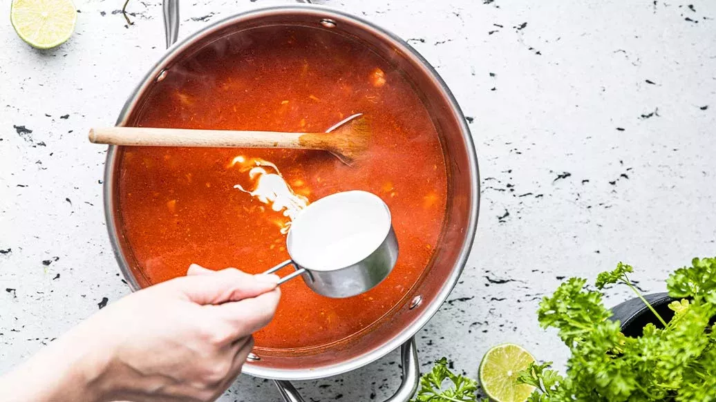 Adicione a polpa de tomate, o molho de soja Kikkoman e o caldo quente. Cozinhe em lume brando durante 10 minutos.