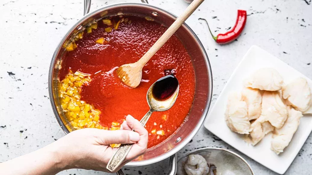 Uma sopa de tomate deliciosa, intensa e cremosa, com bacalhau tenro e camarões suculentos, para uma refeição reconfortante e cheia de sabores vibrantes.