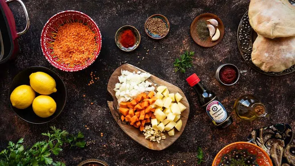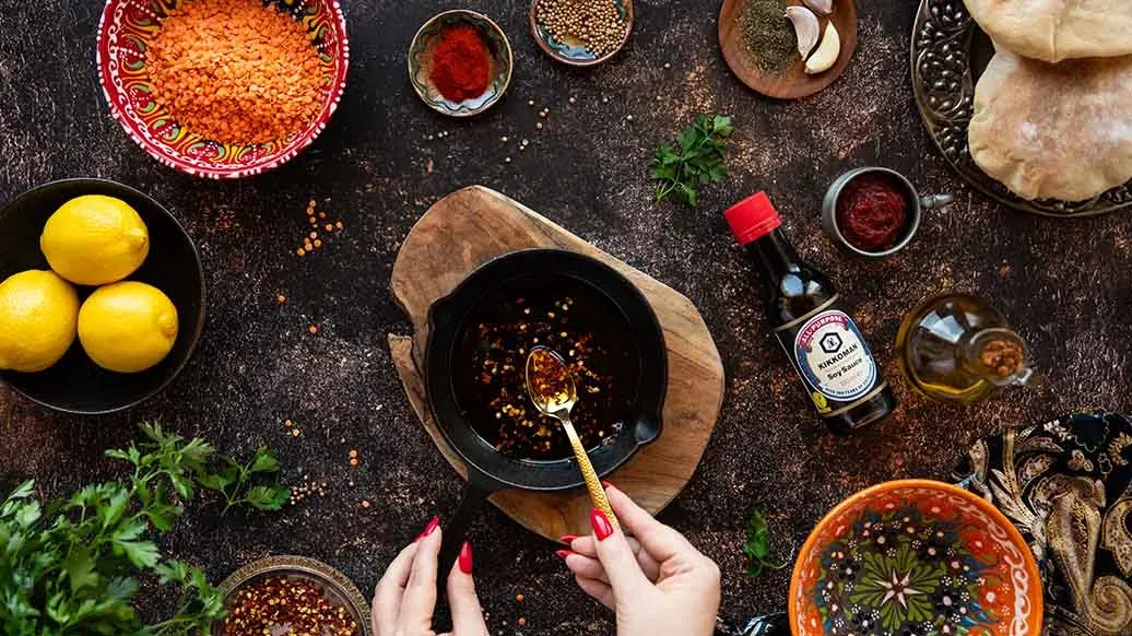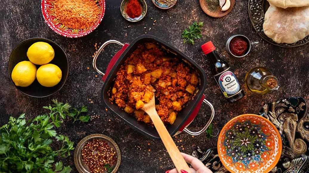 Uma sopa reconfortante de lentilhas vermelhas, cenouras, batatas e alho, cozida em lume brando com especiarias e polpa de tomate. O Molho de Soja Kikkoman confere-lhe um sabor umami rico e intenso, enquanto a hortelã, a salsa, a malagueta e o limão lhe dão um toque final fresco e vibrante.