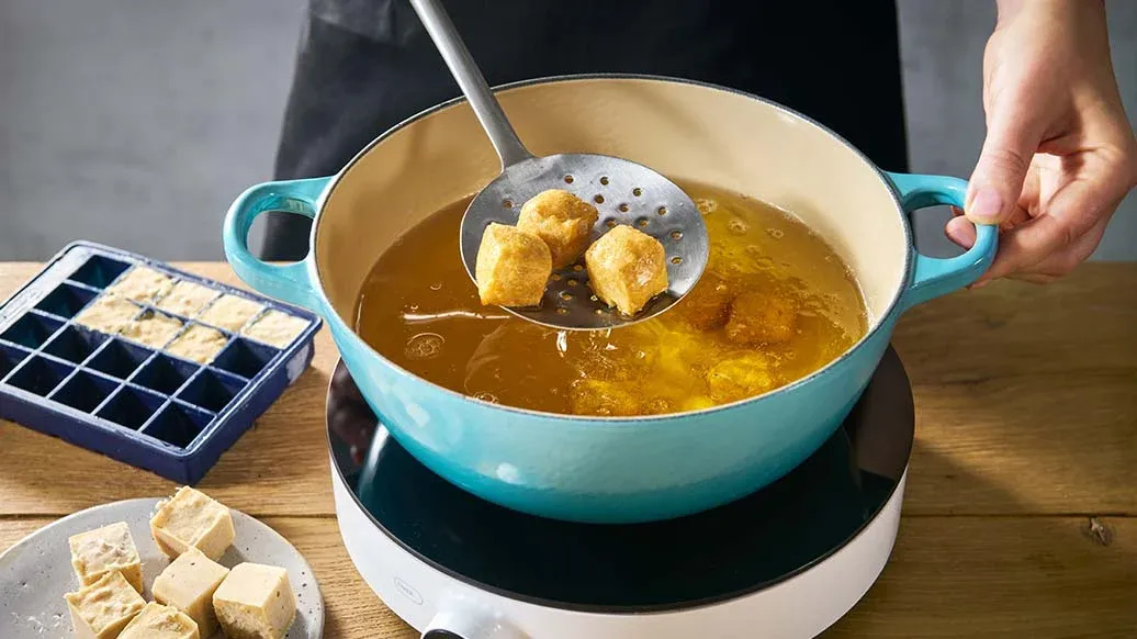 Frite os takoyaki congelados em óleo quente até ficarem dourados.