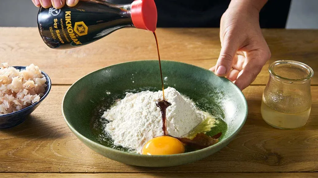 Misture os dois tipos de farinha, o fermento em pó, o molho de soja Kikkoman, o ovo e o caldo dashi arrefecido numa tigela e misture até ficar homogéneo.