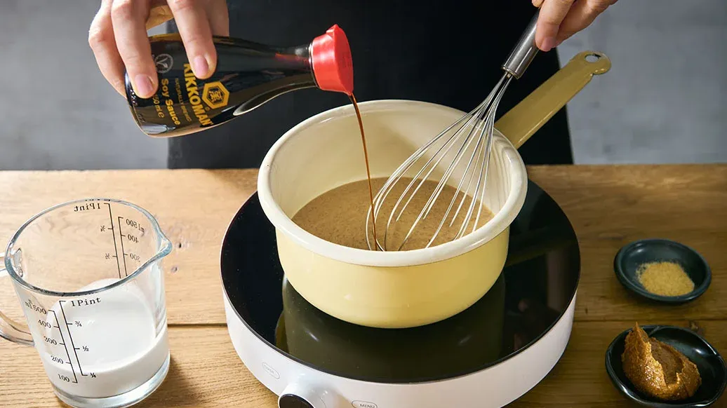80 ml de leite de coco – 70 g de manteiga de amendoim – 30 ml Kikkoman Molho de Soja Fermentado Naturalmente – 20 ml de vinagre de arroz – ½ colheres de chá de alho granulado