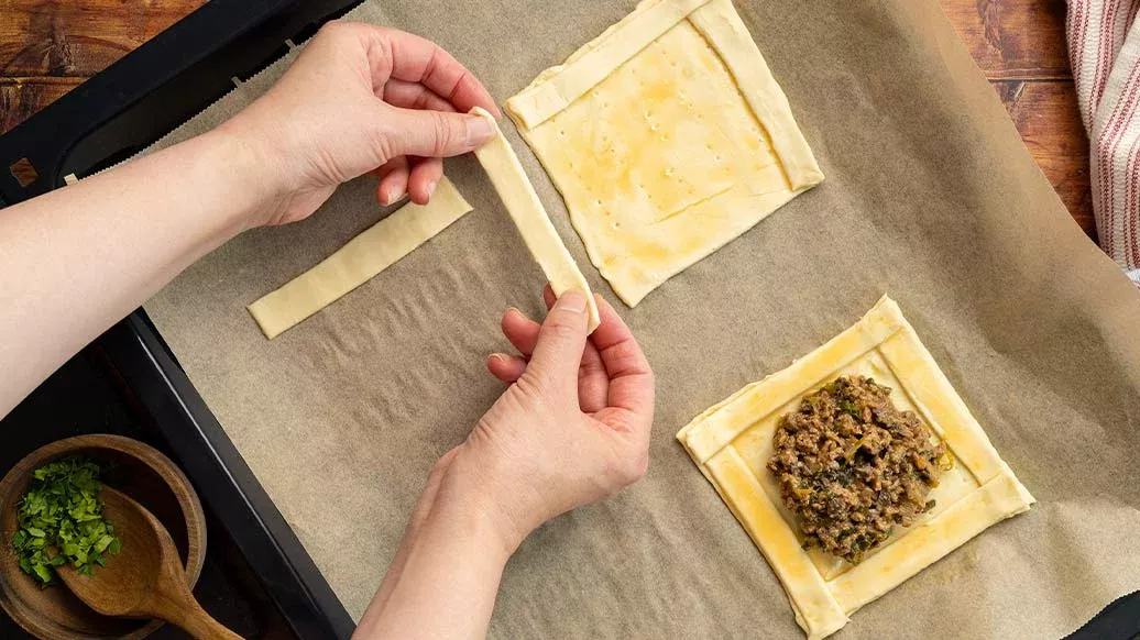 Pincele todas as superfícies com o ovo. Coloque as 4 tiras em todos os bordos. Coloque o recheio preparado no passo 1 no meio e pincele novamente os bordos com o ovo.