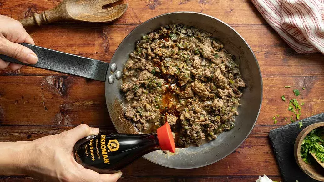 Corte as cebolas em rodelas e pique bem os cogumelos. Adicione o óleo de sésamo Kikkoman a uma frigideira e frite os cogumelos e as cebolinhas quando a frigideira estiver quente. Quando estiverem macios, adicione a carne picada.
