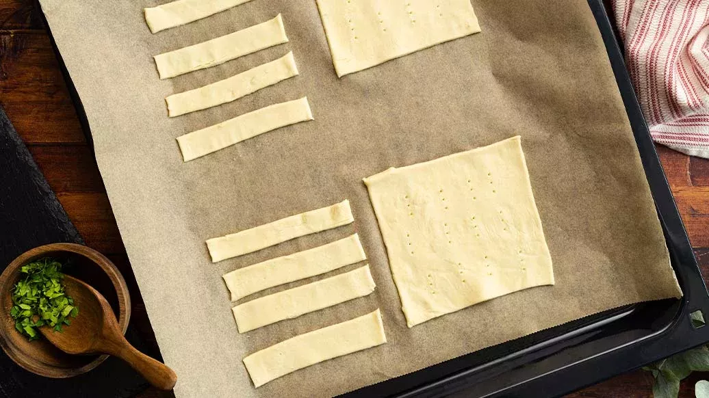 Desenrole as folhas de massa folhada e corte-as em 8 quadrados (8 x 8 cm), depois corte 4 deles em 4 tiras compridas (2 x 8 cm cada).