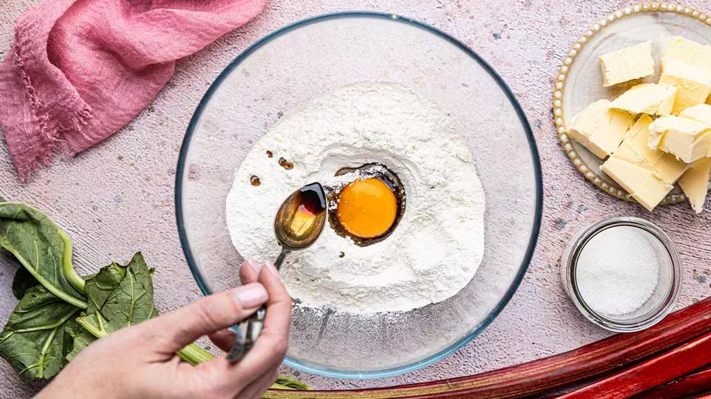 Estique a massa. Coloque o ruibarbo no centro e dobre as bordas da massa. Coza num forno pré-aquecido a 200 °C durante cerca de 30-35 minutos.
