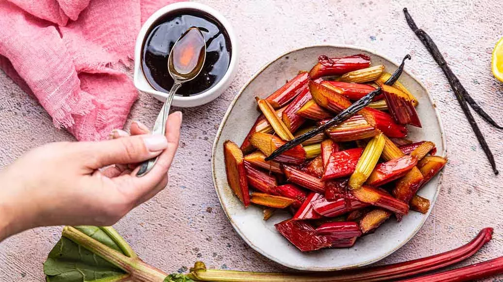 500 g de ruibarbo – 150 g de açúcar – 80 ml de água – 2 colheres de sopa Kikkoman Molho de Soja Fermentado Naturalmente Com Teor Reduzido de Sal – 1 colheres de sopa de sumo de limão – 1 vagem de baunilha