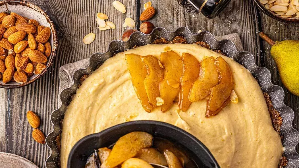 Tarte vegan com peras caramelizadas