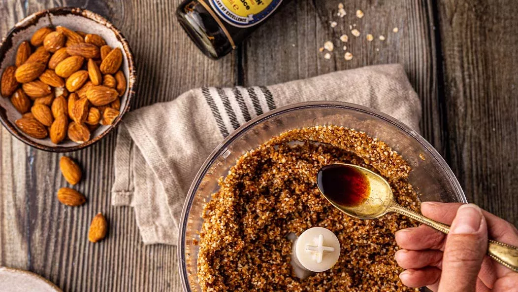 100 g de tâmaras secas – 100 g de amêndoas – 40 g de aveia – 2 colheres de chá Kikkoman Molho de Soja Fermentado Naturalmente – 2 colheres de sopa de manteiga de amêndoa (manteiga vegan)