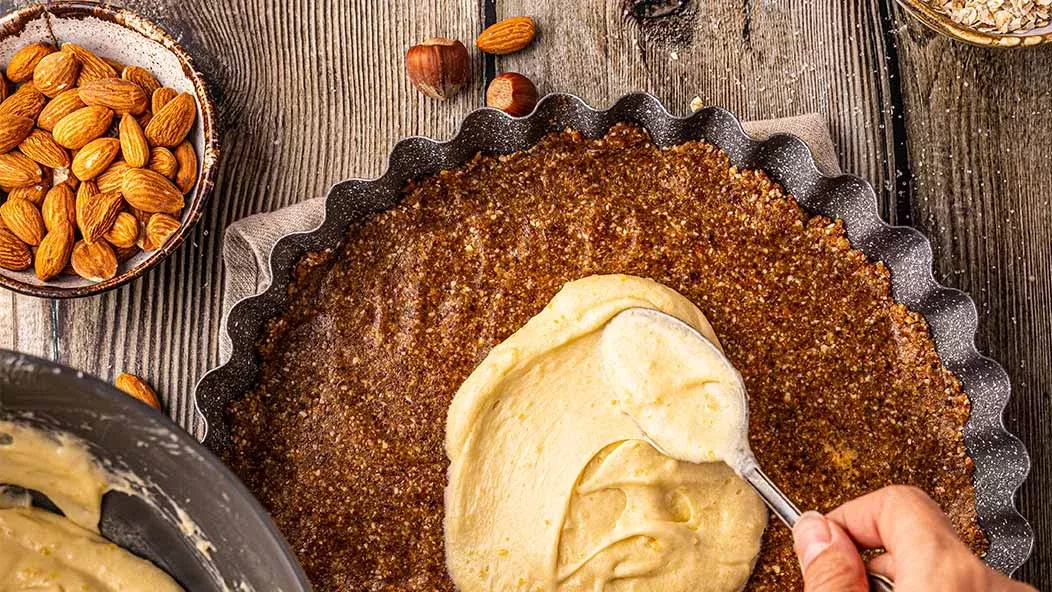 Esmague todos os ingredientes para a crosta da tarte e misture-os até obter uma massa espessa e pegajosa.