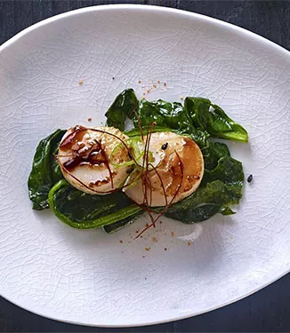 Adicione o molho de soja com pimenta e coloque no lume novamente. Agite a frigideira para que o molho cubra as vieiras por todos os lados. Sirva as vieiras quentes com os espinafres fritos, polvilhe com o restante molho e decore com cebolinhas e bagas de chili.